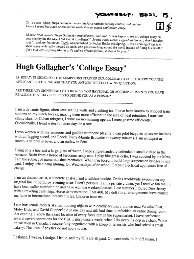 The laws of physics do not apply to me. On weekends, to let off steam, I participate in full-contact origami. Years ago I discovered the meaning of life but forgot to write it down. I have made extraordinary four course meals using only a mouli and a toaster oven. I have won bullfights in San Juan, cliff-diving competitions in Sri Lanka, and spelling hugh gallagher college essay at the Kremlin. I have played Hamlet, I have performed open-heart surgery, hugh gallagher college essay, and I have spoken with Elvis. Good for him. Just goes to show that risk taking can pay off. everyone raves and raves about this essay i personally do not see why it is so good stringing a bunch of "creative" sentences together is much easier than writing an actual personal statement The urban myth is that is that it was submitted by him for consideration in admission to NYU.